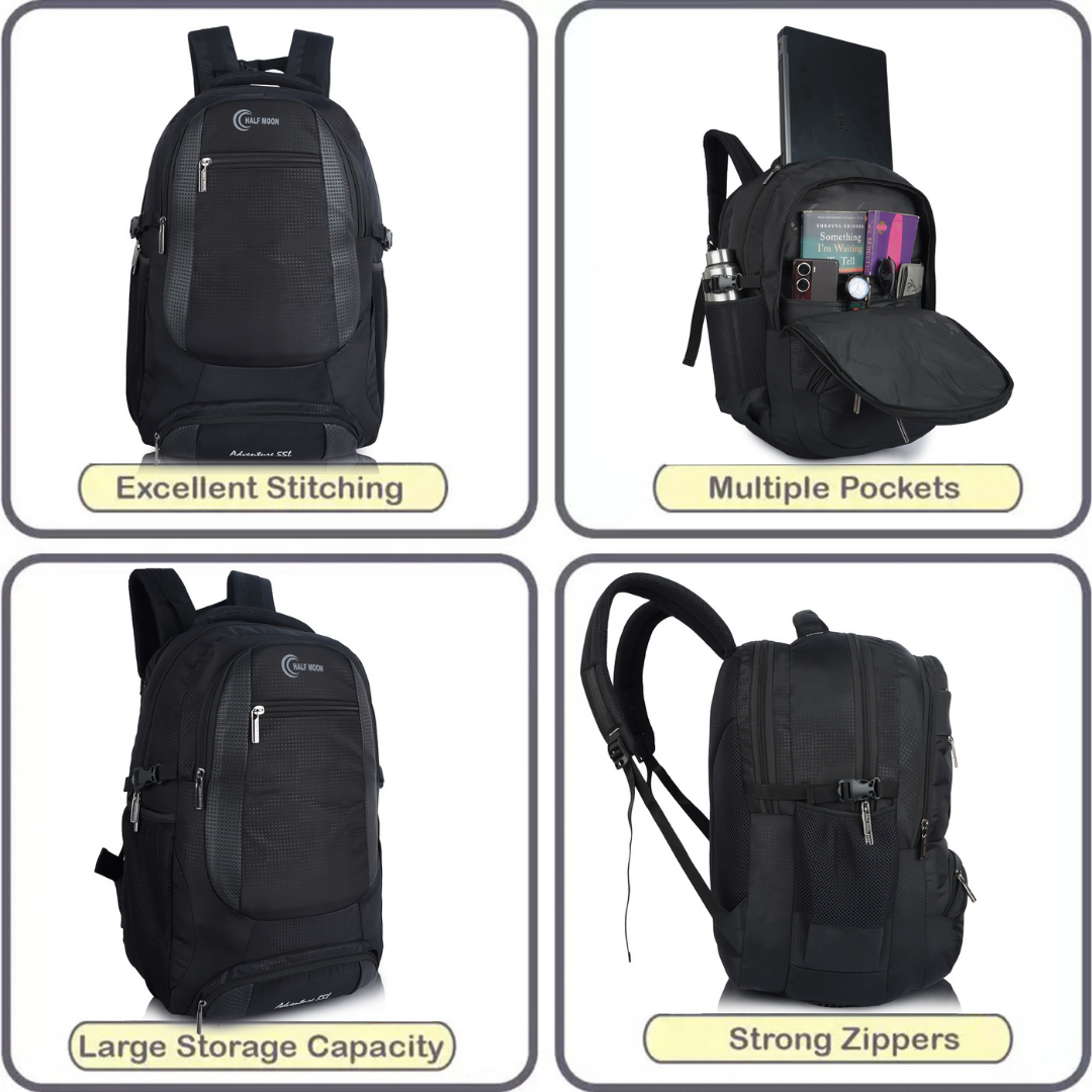 the base that most rucksack bags skip, Half Moon includes as standard. - 3 Separate Body Compartments: A large main section for trekking gear and